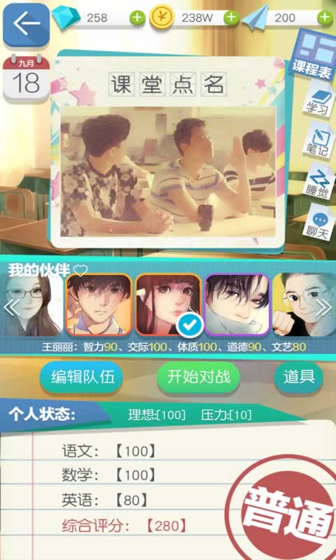 进入游戏先自定义性别、外貌与性格,开局选项不多但足够区分人设,性格会影响对话倾向与npc好感度,不用反复刷初始。日常以学习、社交、活动三条线推进,课堂答题、社团任务、运动会等以轻交互形式呈现,点按与选择为主,长时间玩不费手。剧情分支明确,选不同回应会触发不同对话与关系走向,朋友线与恋爱线并行,不强制也不敷衍。养成围绕属性与社交展开,学习加学识、活动加魅力、社交加人脉,数值温和不逼肝,日常清完任务就能稳步推进,不用额外刷资源。场景切换流畅,教学楼、操场、图书馆等区域点击直达,没有复杂路径与加载卡顿,手机配置一般也能稳定运行。